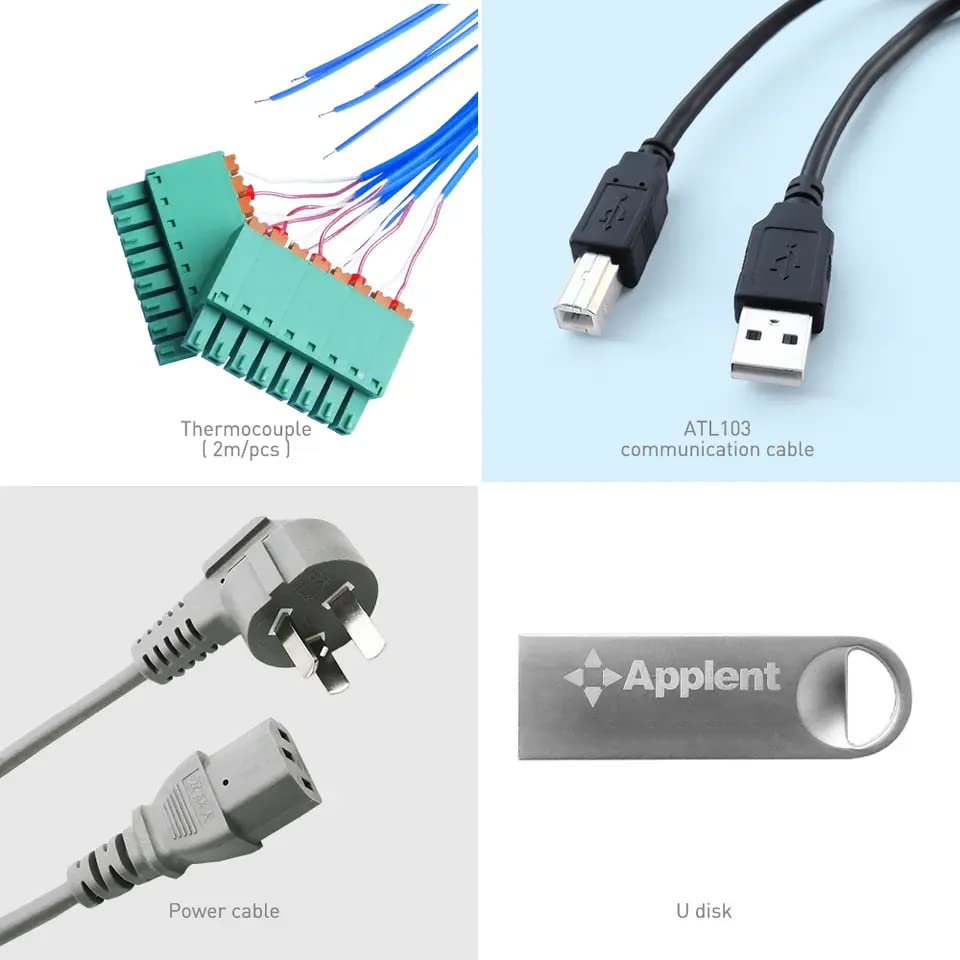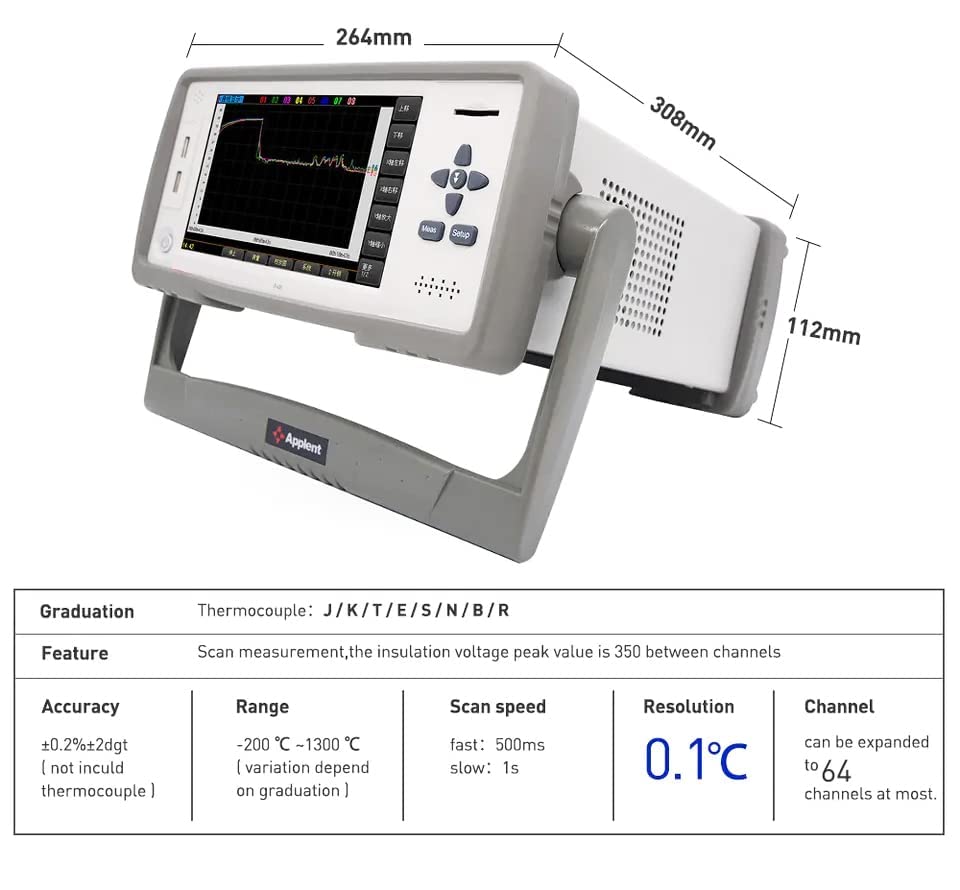 YFYIQI 40 Channel Temperature Meter Thermocouple Thermometer Industrial Temperature Measurement Instrument with Accuracy 0.2%+1℃ Resolution 0.1℃ Feature: 7 inches TFT true color LCD display Histogram display, graph Highest value, lowest value, average value display Cold junction compensation Standard USB disk interface, support for large-capacity storage devices. Standard RS232C interface and USB interface Automatic detection of broken couple Specified channel scan Standard data acquisition software Specification: Graduation:Thermocouple:J/K/T/E/S/N/B/R Accuracy:0.2%+1℃ Range:-20℃~200℃ Resolution:0.1℃ Channels:40 channels; Correction:Error correction for each channel Comparator:high & low beep function for each channel Interface:RS232C, U-disc, USB Software:ATS45 data acquisition software Cold Junction:Accuracy: 0.5℃ Other Functions:TFT-LCD True color display, broken thermocouple check function Power Supply:V: 85VAC~260VAC Fre:50Hz/60Hz Power:10VA Dimension & Weight:216x88x300mm weight:3kg Accessories:K thermocouple 40channels (2 meters/ channel) Application: Suitable for multi-point temperature testing of manufacturers and quality inspection departments in home appliances, motors, electric appliances, thermostats, transformers, ovens, thermal protectors, power supplies, lighting, electric power, LED, etc.