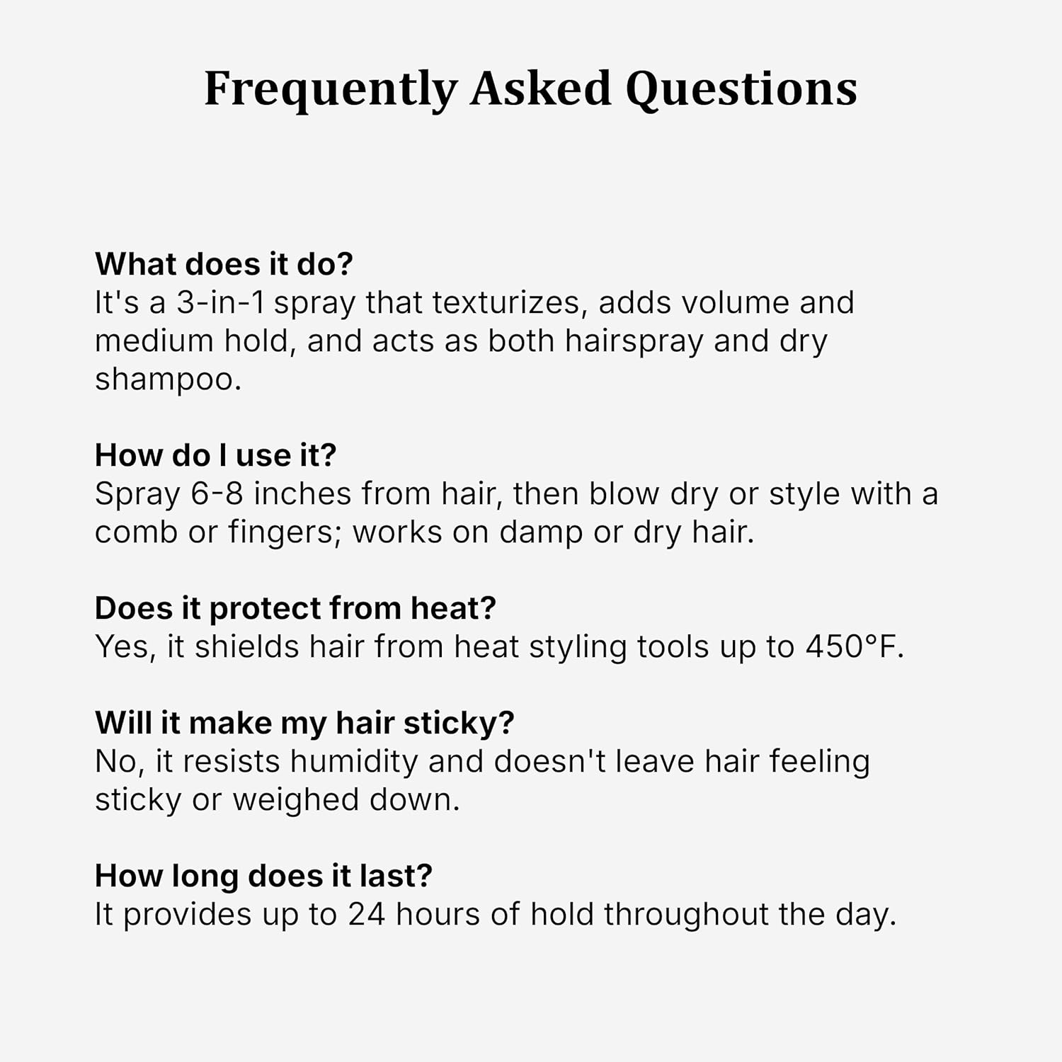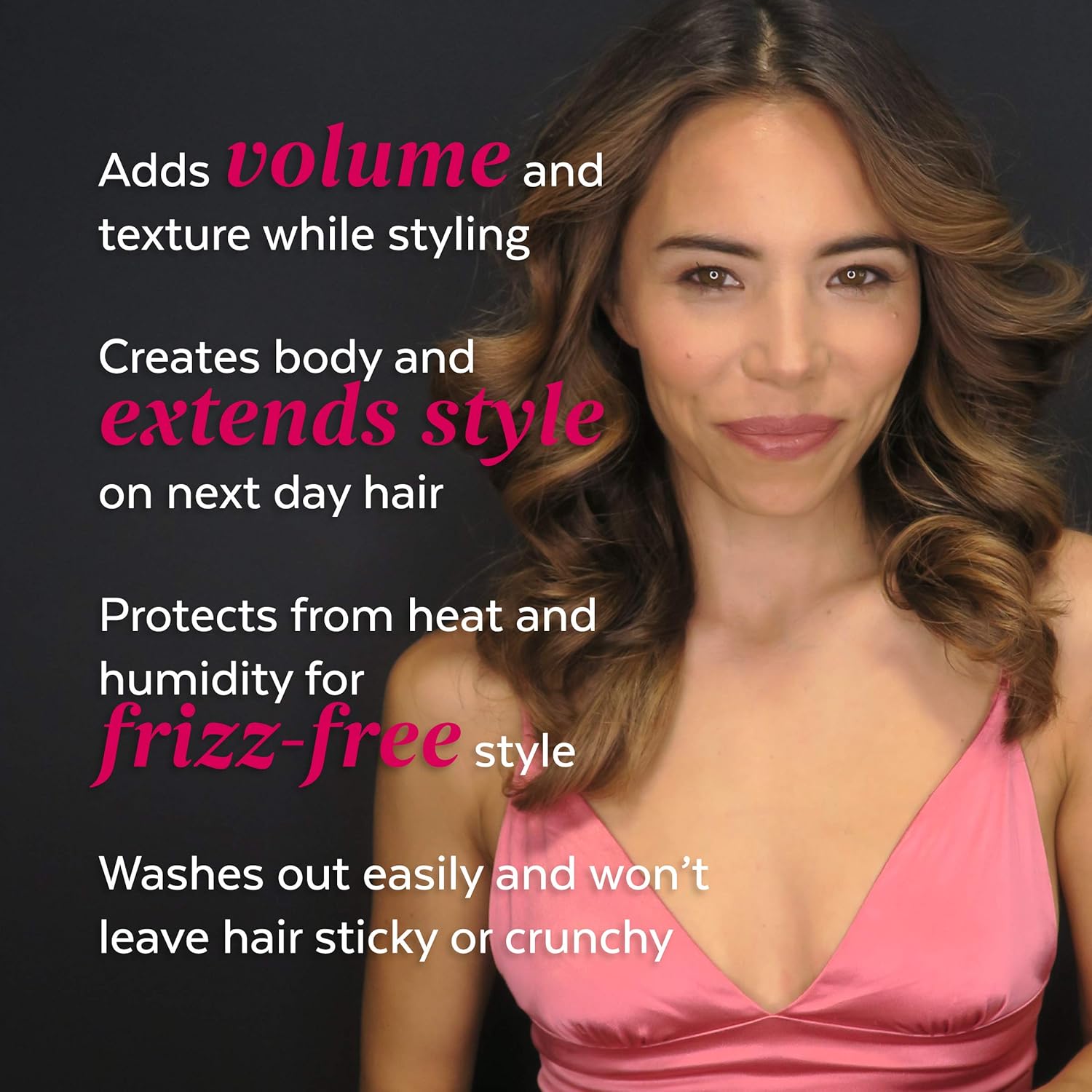 | Product Benefits | Provides grip and hold for styling, shields hair from heat stylers up to 450 degrees, resists humidity for all day styles & won’t leave hair feeling sticky. |