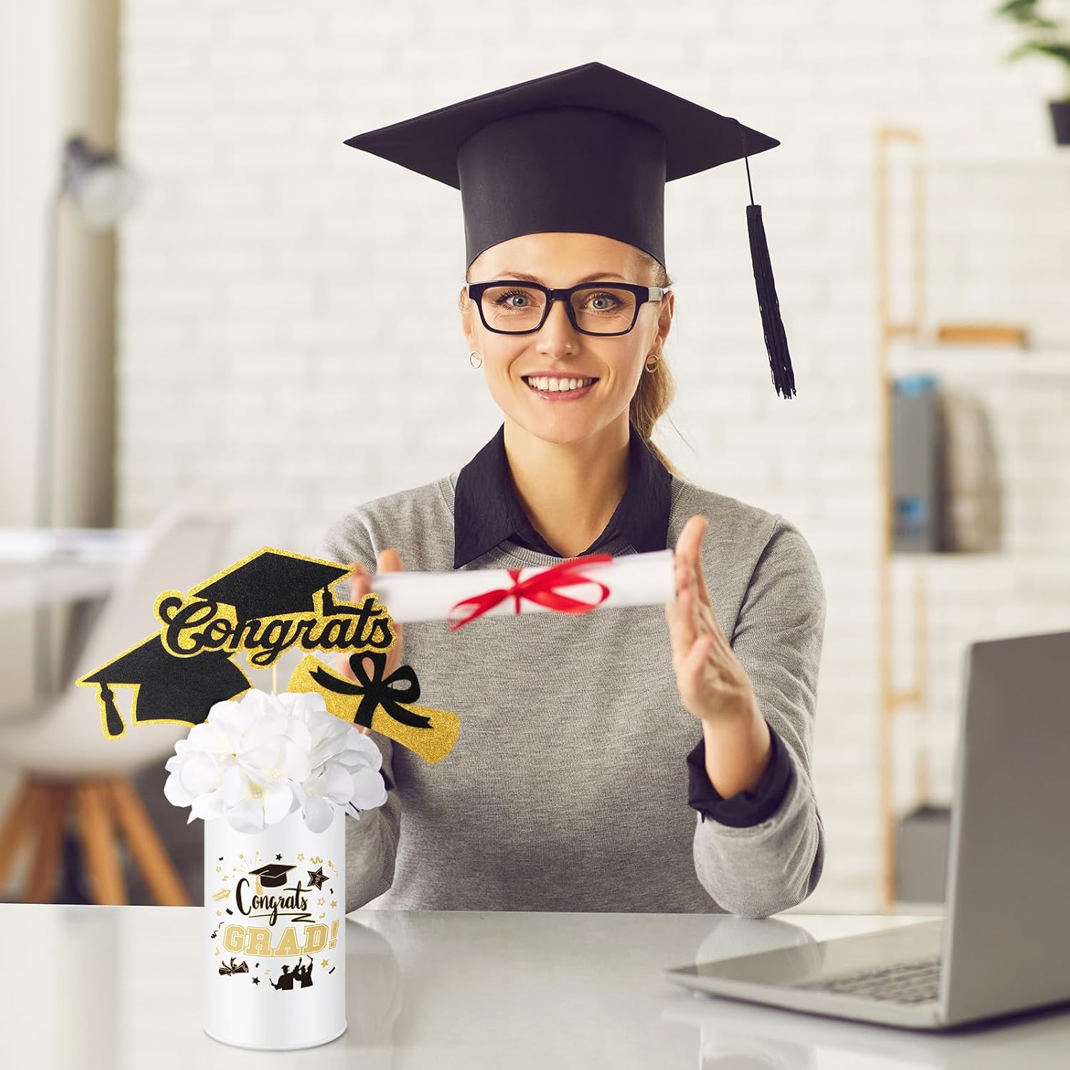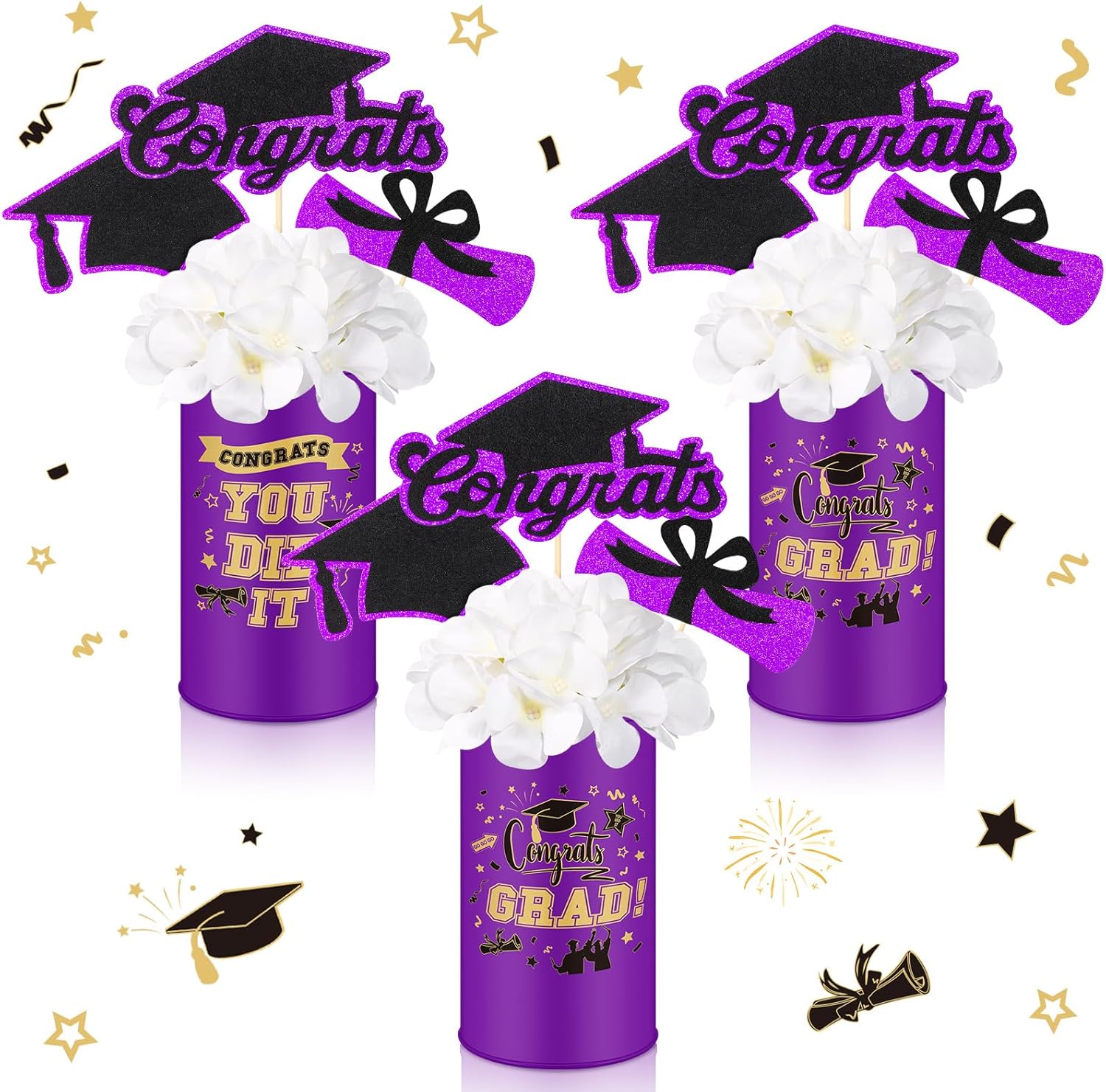 | Included Components | 3 X artificial flower, 3 X metal vase, 9 X congrats grad sticks pick |