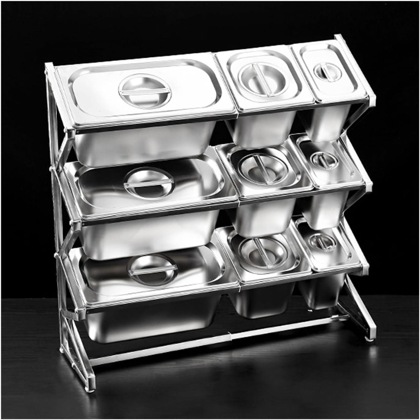 1. The seasoning rack to keep your spices and seasonings organized and easily accessible2. Maximize your kitchen space while keeping your cooking essentials within reach with this versatile spice rackSpecificationProduct Name: Spice Racks/Commercial Condiment Racks/Seasoning Container/Food Dispenser/Condiment Container Dispenser/Food ContainerMaterial: Stainless steelColor: SilverOrganizer shelf size: 64.5x17x61.5cm1 inch = 2.54 CM;1 ft = 30.48 CMStretchable stainless steel shelf length: The longest adjustable to 63cm; The shortest adjustable to 33.5cmUse scenario: kitchen/buffet restaurant/hot pot restaurant/barbecue restaurant/food pantry/cafe/beverage shop/restaurant/food truck/buffet topping stationSeasoning container: Jam/Seasoning/Dried Fruit/Sauce/Salad/Fruit/SpicesPacking listSilver:1 x Rack,9 x Basin (basin size: 17.6x10.8x10cm,17.6x16x10cm,32.5x17.5x10cm)Silver-A:1 x Rack,9 x Basin (basin size: 17.6x10.8x15cm,17.6x16x15cm,32.5x17.5x15cm)Silver-B:1 x Rack,9 x Basin + Cover (basin size: 17.6x10.8x10cm,17.6x16x10cm,32.5x17.5x10cm)Silver-C:1 x Rack,9 x Basin + Cover (basin size: 17.6x10.8x15cm,17.6x16x15cm,32.5x17.5x15cm)