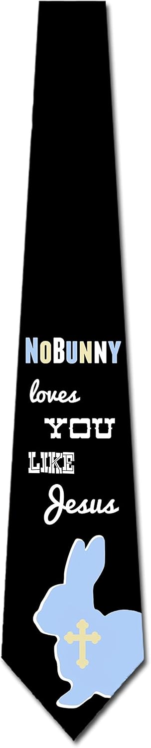 Hoppy Easter! Celebrate in style with this colorful pastel necktie featuring the phrase "No Bunny Loves You Like Jesus" and a small bunny and cross. Bright pastels are contrasted against a black background.This original tie design is produced by Three Rooker - the original creator of the novelty tie and is crafted in 100% microfiber to provide years of quality service.